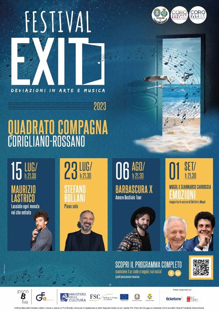 Per la qualità dell’offerta e la pluralità delle espressioni artistiche, l’innovazione, la qualificazione delle competenze, l’interazione tra lo spettacolo dal vivo e la filiera culturale, educativa e del turismo messe in campo dall’organizzazione, il Festival “Exit. Deviazioni in arte e musica” è riconosciuto dal Ministero della Cultura a valere sul Fondo Unico per lo Spettacolo e dalla Regione Calabria a valere sul Piano di Sviluppo e Coesione 6.02.02 e promosso dal brand Calabria Straordinaria.