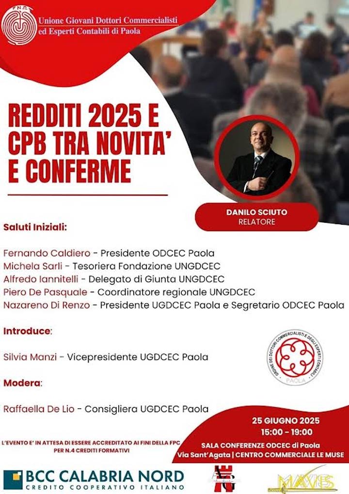 Domani, a Paola, alle 15, nella Sala Conferenze Odcec, si terrà il convegno ““Redditi 2025 e CPB: tra novità e conferme”, promosso dall’Unione Giovani Dottori Commercialisti ed Esperti Contabili di Paola (UGDCEC) e giunto con successo alla sua terza edizione.