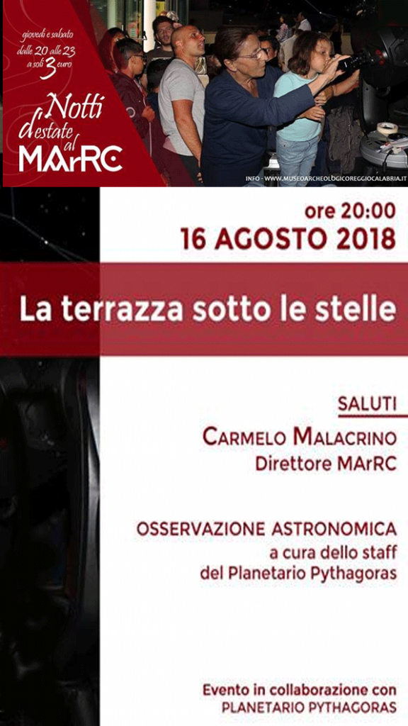Il prossimo appuntamento con il Planetario Pythagoras sarà il 25 agosto, con la straordinaria conferenza del prof. Roberto Buonanno su “Dante e la Cosmologia”. (rrc)