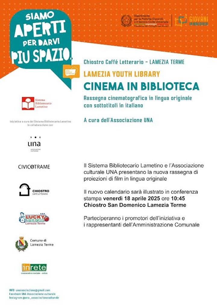 L’evento rientra nell’ambito della rassegna Cinema&Cinema – Proiezioni di comunità” , a cura di ARCI Lamezia Terme – Vibo Valentia APS e con la direzione artistica di Ivan Falvo D’Urso e Domenico Isabella, rientra nell’Avviso Pubblico 2025 “Festival e Rassegne Cinematografiche e Audiovisive in Calabria”, promosso dalla Calabria Film Commission con il patrocinio del Comune di Lamezia Terme.